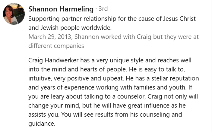 Three years ago, I was highly encouraged by a friend to take my son to Craig Handwerker for counseling. Her son had significantly benefited from Craig’s counsel, and she raved about him. From Session One he was able to identify and diagnose troublesome issues. Craig also quickly picked up on some issues needing to be addressed at a family level. He has proved himself valuable as our family counselor, including marriage counseling, and individual therapy for all members.