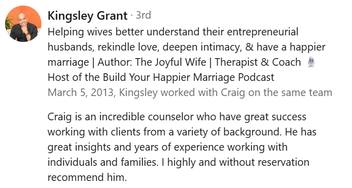 “Craig approaches each session with humility and an open mind, encouraging honesty as the foundation for lasting change.”