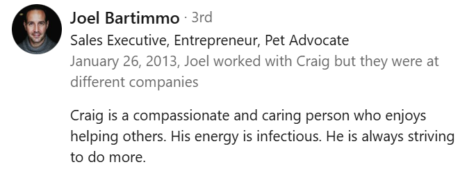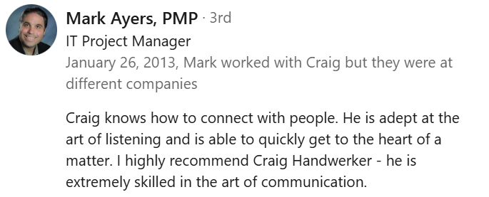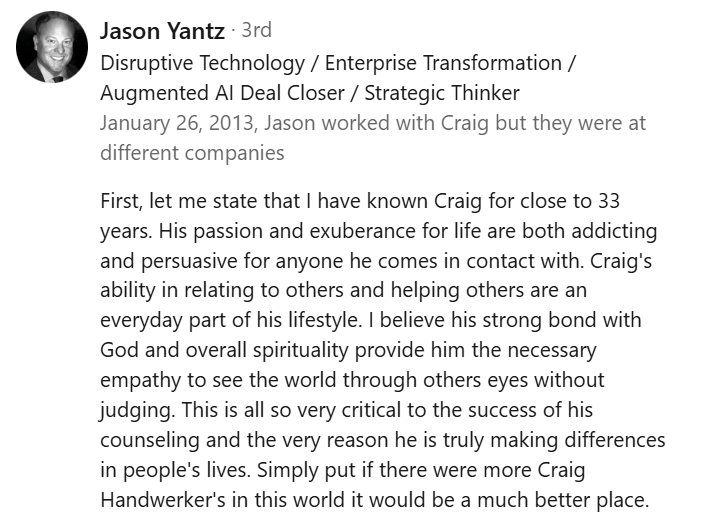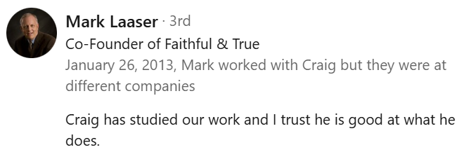 I have learned of other friends, and church staff members who either have used or know Craig personally, and each one has had positive input on his character and professionalism.