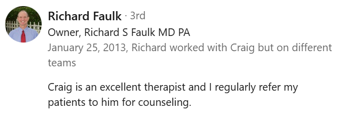 Needless to say, I am very pleased with Craig as a counselor, and have recommended him to others.